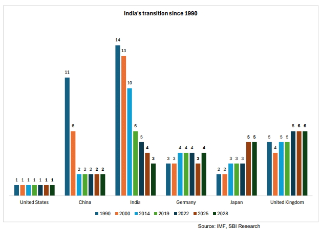 SBI के मुताबिक, भारत को लो-इनकम देश से लोअर-मिडिल इनकम देश बनने में करीब 60 साल लगे. 1962 में प्रति व्यक्ति आय 90 डॉलर थी, जो 2007 में बढ़कर 910 डॉलर हो गई. इस दौरान औसत Annual growth rate 5.3 प्रतिशत रही. इसके बाद रफ्तार तेज हुई. भारत को 1 ट्रिलियन डॉलर की अर्थव्यवस्था बनने में छह दशक लगे. लेकिन अगले 1 ट्रिलियन सिर्फ सात साल में जुड़ गए.