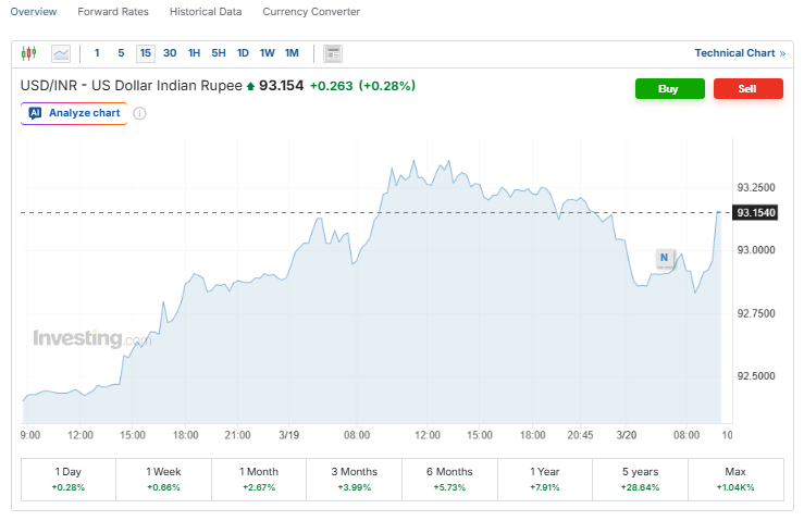 पहली बार रुपया 93 के पार, डॉलर के मुकाबले बड़ी गिरावट; ईरान युद्ध ने बढ़ाया रिस्क