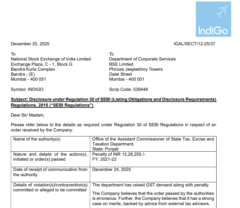 InterGlobe Aviation के अनुसार, यह टैक्स डिमांड ऑर्डर पंजाब राज्य के एक्साइज और टैक्सेशन विभाग के तहत Assistant Commissioner of State Taxes कार्यालय द्वारा जारी किया गया है. यह जुर्माना वित्त वर्ष 2021-22 से जुड़ी GST मांग के संबंध में लगाया गया है. कंपनी को इस आदेश की जानकारी 24 दिसंबर 2025 को मिली थी, जिसके बाद 25 दिसंबर को स्टॉक एक्सचेंज को औपचारिक सूचना दी गई.