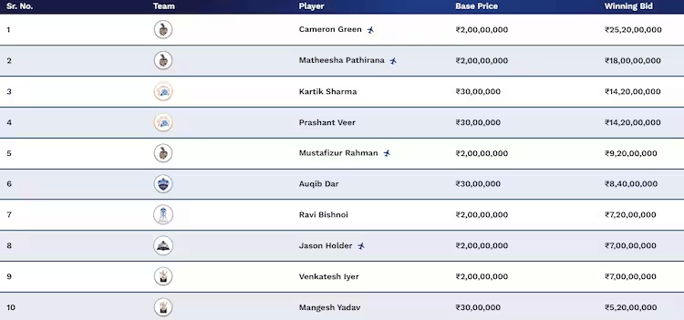 जैसा कि आप देख सकते हैं कि इस साल के ऑक्शन में टॉप 10 खरीदारों में से 6 भारतीय हैं. इनमें से 6 में से 4 अनकैप्ड भारतीय हैं.