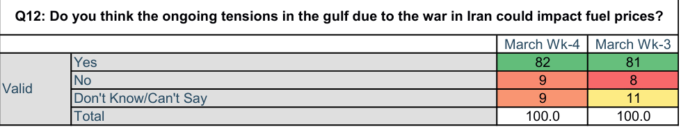 इससे इतर, सर्वे में यह भी पूछा गया कि क्या ईरान युद्ध की वजह से से खाड़ी देशों में फैली अशांति से पेट्रोल-डीजल के भाव पर भी दबाव पड़ सकता है. इसको लेकर तकरीबन 81 फीसदी लोगों का कहना है कि जारी तनाव का असर फ्यूल के प्राइसिंग पर पड़ सकता है. वहीं, 9 फीसदी लोगों का कहना है कि ऐसा कुछ नहीं होगा. वहीं, 9 फीसदी लोगों ने ‘कुछ कह नहीं सकते’ पर टिक किया.
