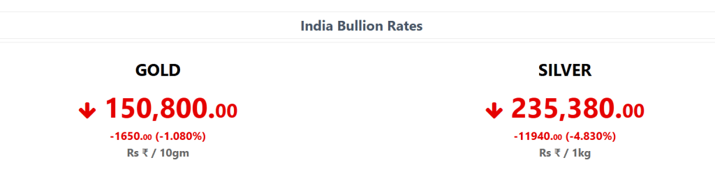 MCX गोल्ड अप्रैल कॉन्ट्रैक्ट 1% से ज्यादा फिसल गया, जबकि सिल्वर मार्च फ्यूचर्स में 6% की बड़ी गिरावट दर्ज की गई. कारोबारी सत्र के दौरान चांदी ₹2,29,187 प्रति किलो पर जा पहुंची, वहीं सोना करीब 2% टूटकर ₹1,49,396 प्रति 10 ग्राम पर आ गया. आज सोना 1650 रुपये से ज्यादा सस्ता हो गया. जबकि चांदी भी 12550 रुपये से ज्यादा सस्ती हो गई.