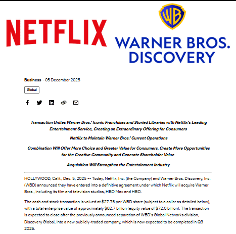 यह अधिग्रहण दो अग्रणी एंटरटेनमेंट बिजनेस को एक साथ लाएगा, जो Netflix के इनोवेशन,ग्लोबल रीच पहुंच और बेहतरीन स्ट्रीमिंग सेवा को Warner Bros. की एक सदी पुरानी विश्वस्तरीय कहानी कहने की विरासत के साथ जोड़ेगा. इस सौदे के बाद The Big Bang Theory, The Sopranos, Game of Thrones, The Wizard of Oz और DC Universe जैसी लोकप्रिय फ्रेंचाइजी, शो और फिल्में Netflix के विशाल पोर्टफोलियो में शामिल हो जाएंगी. Netflix की मौजूदा सफल सीरीज में Wednesday, Money Heist, Bridgerton, Adolescence और Extraction शामिल हैं. यह संयोजन दुनिया भर के दर्शकों के लिए एक असाधारण मनोरंजन का अनुभव तैयार करेगा.