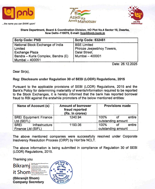 PNB 2434 Crore Rupees Fraud Case: देश के बड़े सरकारी बैंकों में शामिल पंजाब नेशनल बैंक (PNB) एक बार फिर बड़े फ्रॉड के मामले को लेकर सुर्खियों में है. इस बार बैंक ने 2,434 करोड़ रुपये के एक बड़े लोन फ्रॉड से जुड़ी जानकारी भारतीय रिजर्व बैंक (RBI) को दी है. यह मामला SREI Equipment Finance Ltd और SREI Infrastructure Finance Ltd से जुड़ा हुआ है, जिनके पूर्व प्रमोटर्स पर गड़बड़ी के आरोप हैं. बैंक ने यह खुलासा शुक्रवार 26 दिसंबर को स्टॉक एक्सचेंज फाइलिंग के जरिए किया है.