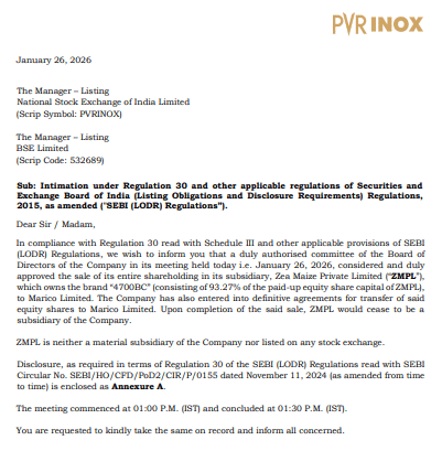 PVR INOX ने अपनी सब्सिडियरी Zea Maize Private Limited (4700BC ब्रांड) में 93.27% हिस्सेदारी Marico Limited को बेचने को मंजूरी दे दी है. ₹226.8 करोड़ की ऑल-कैश डील के बाद ZMPL, PVR INOX की सहायक कंपनी नहीं रहेगी. बोर्ड की अधिकृत समिति ने 26 जनवरी 2026 को इस सौदे को मंजूरी दी.