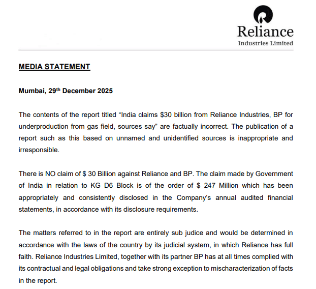 सोमवार, 29 दिसंबर को जारी एक आधिकारिक बयान में रिलायंस ने कहा कि बिना नाम और पहचान वाले सूत्रों के आधार पर इस तरह की रिपोर्ट प्रकाशित करना पूरी तरह अनुचित है. कंपनी ने स्पष्ट शब्दों में कहा कि रिलायंस और BP के खिलाफ 30 अरब डॉलर के किसी भी तरह के दावे का कोई सवाल ही नहीं उठता.