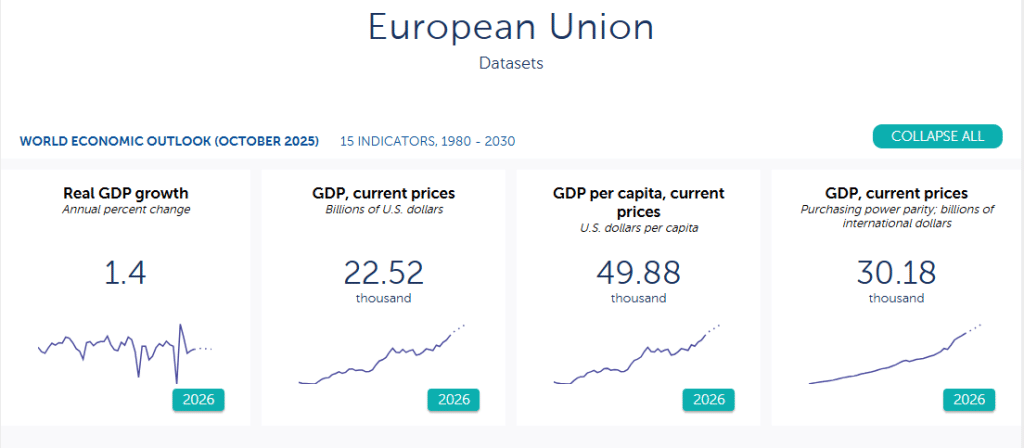 IMF के आंकड़ों के मुताबिक EU की कुल GDP लगभग 22.52 ट्रिलियन डॉलर है.