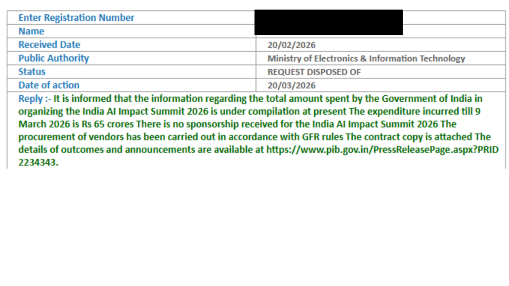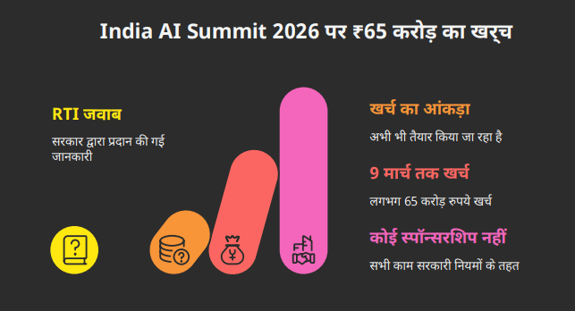 Money9live की टीम की ओर से किए गए एक RTI के जवाब में सरकार ने बताया कि, India AI Impact Summit 2026 के आयोजन पर कुल खर्च का पूरा आंकड़ा अभी तैयार किया जा रहा है. हालांकि, 9 मार्च 2026 तक इस समिट पर करीब 65 करोड़ रुपये खर्च किए जा चुके हैं. सरकार ने यह भी साफ किया है कि इस आयोजन के लिए किसी तरह की स्पांन्सरशिप नहीं ली गई थी और सभी काम सरकारी नियमों (GFR rules) के तहत किए गए.