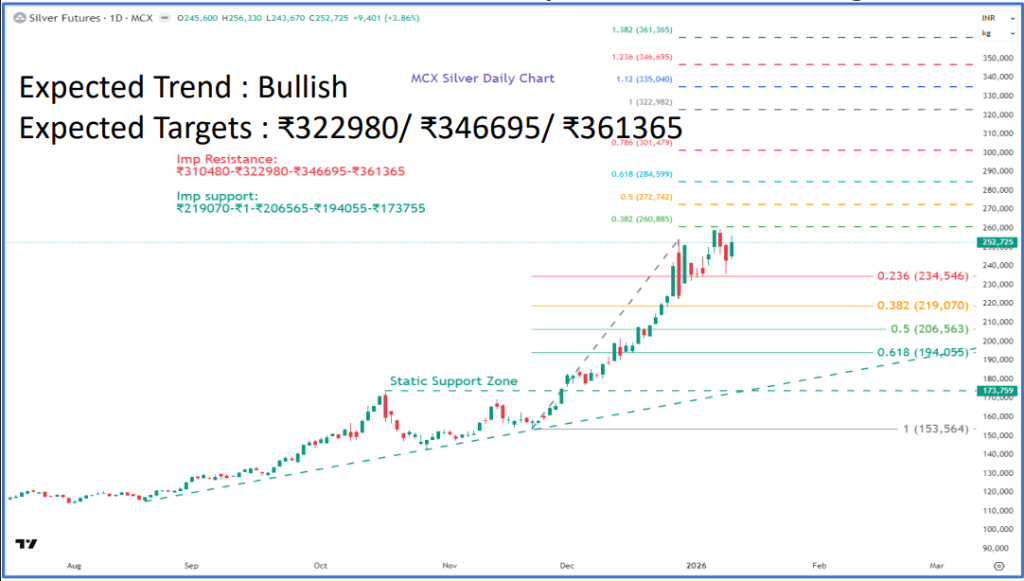 - MCX सिल्वर टारगेट: ₹3,22,980, ₹3,46,695 और ₹3,61,365