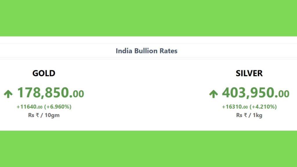बुलियन वेबसाइट के मुताबिक 29 जनवरी को सोना 11640 रुपये महंगा होकर 178,850 रुपये प्रति 10 ग्राम पर पहुंच गया. जबकि चांदी की कीमतों ने 16310 रुपये की जबरदस्त छलांग लगाई, जिससे ये उछलकर 403,950 रुपये प्रति किलो पर जा पहुंची.