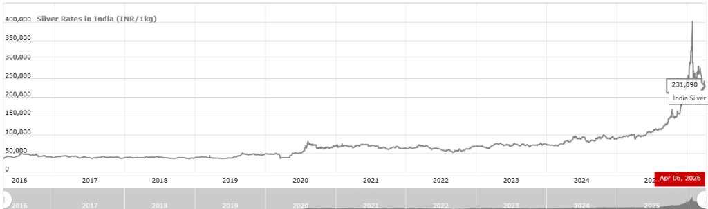 Silver Price Today 6 April 2026: चांदी की कीमतों में गिरावट थमने का नाम नहीं ले रही है. MCX पर 5 मई 2026 को एक्सपायर होने वाले कॉन्ट्रैक्ट में 1 फीसदी से अधिक की गिरावट आई है. इस गिरावट के बाद सिल्वर की कीमत 2,29,827.00 रुपये है. तीन दिन लगातार बाजार बंद रहने की वजह से सिल्वर के भाव 2,33,000 रुपये के आसपास बने हुए थे, लेकिन जैसे ही सोमवार को बाजार खुला, कीमतों में भारी गिरावट दर्ज हुई. सुबह 9 बजकर 20 मिनट पर प्रति किलो चांदी की कीमत में 2,000 रुपये से अधिक की गिरावट आई. यानी लगभग 1 फीसदी गिरावट के बाद प्रति किलो चांदी के भाव 2,31,000 के स्तर पर आ गए हैं. हालांकि बाद में रिकवर होकर यह गिरावट 600 रुपये के आसपास तक पहुंचा है.