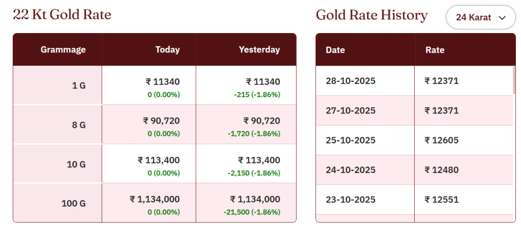 तनिष्क की वेबसाइट के मुताबिक 28 अक्टूबर को 24 कैरेट गोल्ड के भाव 123710 रुपये प्रति 10 ग्राम दर्ज किए गए. 27 अक्टूबर को भी इसकी कीमत यही थी, यानी रिटेल में कीमतें नहीं बदली है् हालांकि 25 अक्टूबर को ये 126050 रुपये प्रति 10 ग्राम थी, यानी तब के मुकाबले अभी रेट कम हुए है. इसी तरह 22 कैरेट गोल्ड के भाव आज 113400 रुपये प्रति 10 ग्राम थी. इसके रेट में भी कोई बदलाव नहीं हुए.