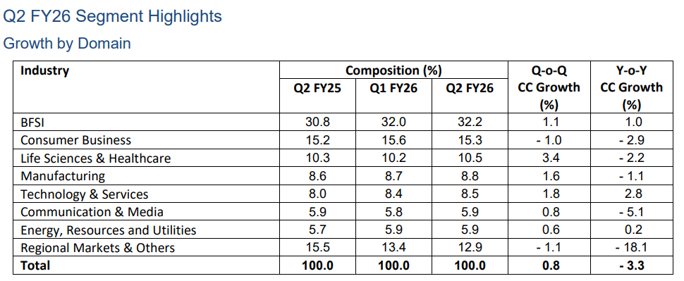 सेगमेंट वाइज ग्रोथ की बात करें तो लाइफ साइंसेज और हेल्थकेयर वर्टिकल में 3.4% QoQ की बढ़त दर्ज की गई. BFSI सेक्टर में 1.1% और मैन्युफैक्चरिंग में 1.6% की वृद्धि रही.