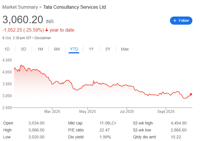 तिमाही नतीजों से पहले मंगलवार को NSE पर TCS का शेयर 1.14% चढ़कर Rs 3,060.20 पर बंद हुआ. हालांकि, इस साल अब तक शेयर 25.59% तक टूट चुका है. फिलहाल, यह 52वीक लो 2866 रुपये के आसपास बना हुआ है.
