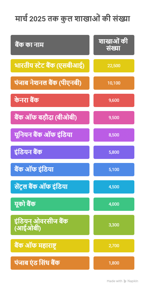 ऊपर दिए गए ग्राफ़ में देखा जा सकता है कि स्टेट बैंक ऑफ इंडिया 22,500 शाखाओं के साथ सबसे आगे है, जबकि पंजाब नेशनल बैंक, केनरा बैंक और बैंक ऑफ बड़ौदा इसके बाद आते हैं.