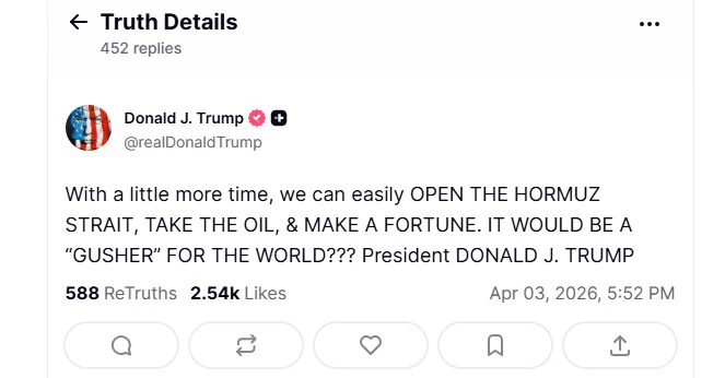 ट्रंप ने लिखा, ‘थोड़ा और समय मिलने पर हम आसानी से होर्मुज जलडमरूमध्य को खोल सकते हैं, तेल हासिल कर सकते हैं और अकूत दौलत कमा सकते हैं. क्या यह दुनिया के लिए एक ‘सोने की खान’ साबित होगा?