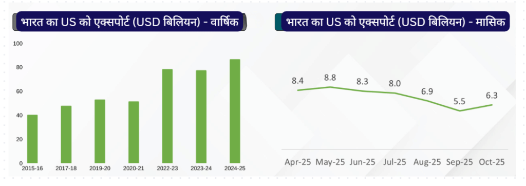 - निर्यात मूल्य में 33% की भारी गिरावट आई. मई 2025 में 4.8 बिलियन डॉलर से घटकर सितंबर 2025 में 3.2 बिलियन डॉलर रह गया.