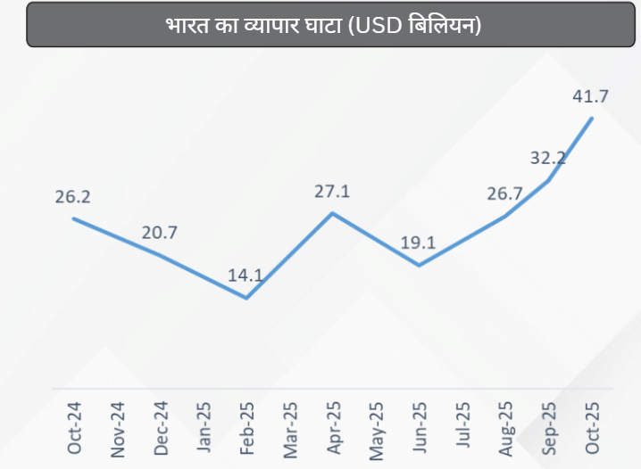 हालांकि सेवाओं का निर्यात लगभग 12% बढ़कर 38.5 अरब डॉलर पहुंचा और कुछ राहत मिली, लेकिन यह उछाल माल व्यापार की भारी गिरावट की भरपाई करने के लिए पर्याप्त नहीं था. नतीजतन, घटते निर्यात, बढ़ते आयात, वैश्विक अनिश्चितताओं और औद्योगिक मांग में कमजोरी ने मिलकर अक्टूबर को भारत के इतिहास का सबसे बड़ा मासिक ट्रेड डेफिसिट बना दिया.