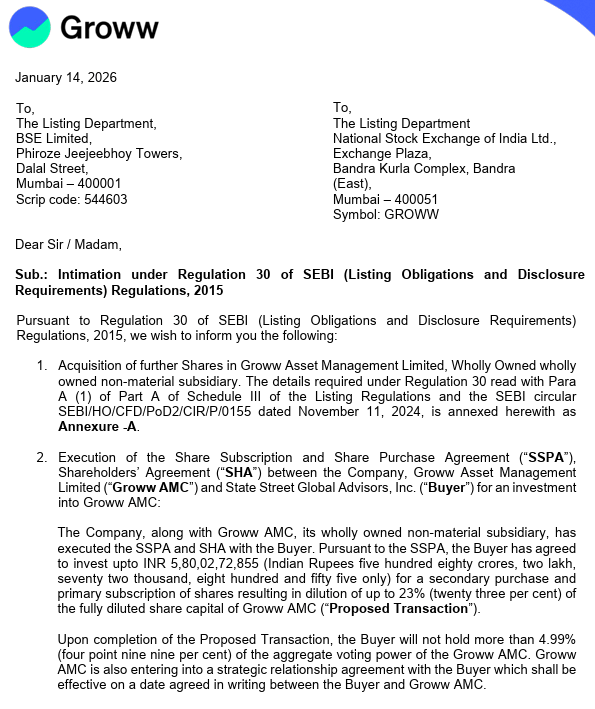 भारत के तेजी से बढ़ते निवेश बाजार में अमेरिकी एसेट मैनेजमेंट कंपनी स्टेट स्ट्रीट इन्वेस्टमेंट मैनेजमेंट ने बड़ा कदम उठाया है. कंपनी ने ग्रो एसेट मैनेजमेंट लिमिटेड (Groww AMC) में 23% हिस्सेदारी खरीदने का ऐलान किया है. यह डील 580 करोड़ रुपये की है. यह सौदा रेगुलेटरी मंजूरी मिलने के बाद पूरा होगा. ग्रो एएमसी, पॉपुलर इन्वेस्टमेंट ऐप ग्रो की पैरेंट कंपनी का हिस्सा है. यह पार्टनरशिप दोनों कंपनियों के लिए फायदेमंद साबित होगी.