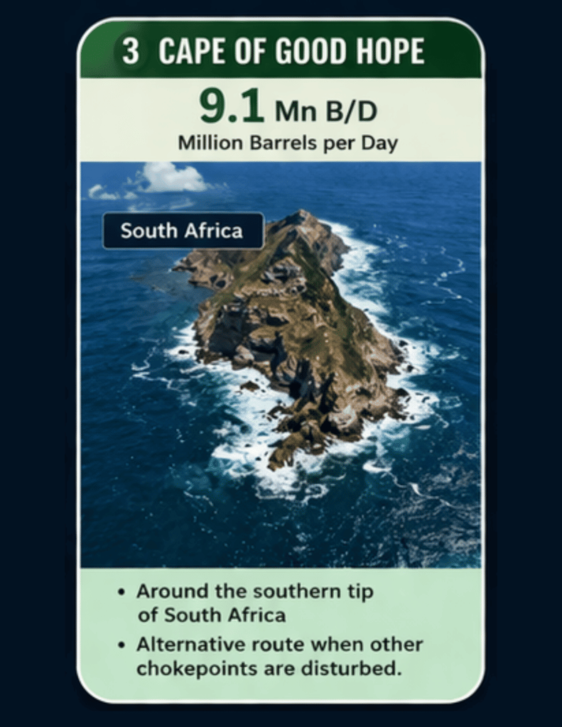 दक्षिण अफ्रीका के पास स्थित यह रास्ता एक विकल्प के रूप में इस्तेमाल होता है. यहां से करीब 9.1 मिलियन बैरल तेल गुजरता है. जब अन्य रास्तों में समस्या होती है, तब जहाज इसी रास्ते का इस्तेमाल करते हैं, लेकिन इससे समय और लागत दोनों बढ़ जाते हैं.