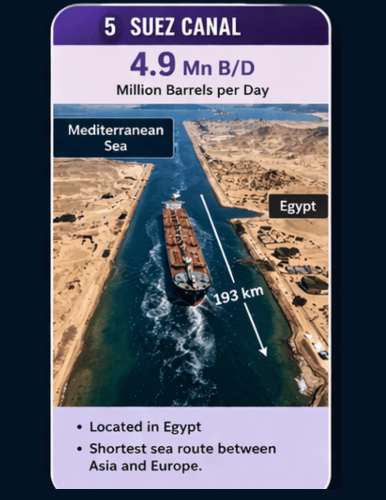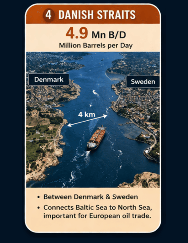 डेनिश स्ट्रेट्स से रोजाना करीब 4.9 मिलियन बैरल तेल गुजरता है. यह यूरोप के लिए अहम है. वहीं Suez Canal भी इतना ही महत्वपूर्ण है, जो एशिया और यूरोप को जोड़ता है. यहां से भी रोजाना करीब 4.9 मिलियन बैरल तेल गुजरता है. यहां रुकावट आने पर सप्लाई चेन प्रभावित हो सकती है.