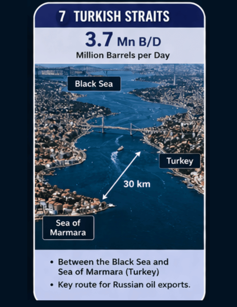 बाब-अल-मंदेब से करीब 4.2 मिलियन बैरल तेल गुजरता है और यह मिडिल ईस्ट को यूरोप से जोड़ता है. वहीं टर्किश स्ट्रेट्स से 3.7 मिलियन बैरल तेल गुजरता है, जो रूस और ब्लैक सी क्षेत्र के लिए अहम है.