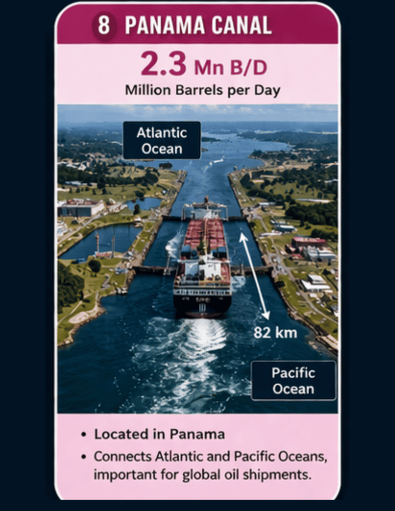 Panama Canal से रोजाना करीब 2.3 मिलियन बैरल तेल गुजरता है. यह अटलांटिक और पैसिफिक महासागर को जोड़ता है और वैश्विक व्यापार के लिए महत्वपूर्ण है. दुनिया के ये ऑयल चोकपॉइंट्स वैश्विक ऊर्जा सप्लाई की रीढ़ हैं. अगर इनमें किसी भी तरह की रुकावट आती है, तो तेल की कीमतों में तेजी और सप्लाई में संकट आ सकता है.