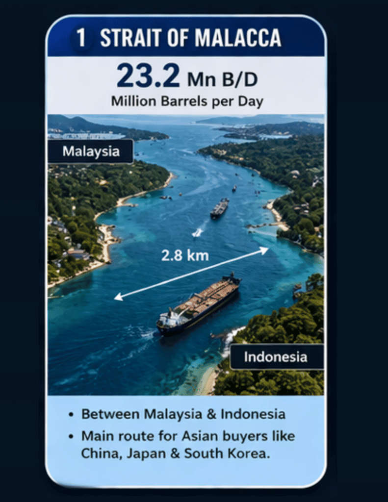 स्ट्रेट ऑफ मलक्का दुनिया का सबसे व्यस्त तेल मार्ग है. यहां से रोजाना करीब 23.2 मिलियन बैरल तेल गुजरता है. यह एशिया के देशों जैसे चीन, जापान और दक्षिण कोरिया के लिए बेहद जरूरी है. अगर यहां कोई समस्या आती है, तो तेल की सप्लाई और कीमतों पर बड़ा असर पड़ सकता है.
