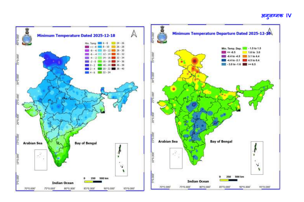 दिसंबर का महीना जैसे-जैसे अपने आखिरी पड़ाव की ओर बढ़ रहा है, वैसे-वैसे देश के अलग-अलग हिस्सों, खासकर उत्तर भारत में ठंड का असर तेज होता जा रहा है. भारतीय मौसम विज्ञान विभाग (IMD) लगातार प्रेस कॉन्फ्रेंस और बुलेटिन के जरिये मौसम की ताजा जानकारी दे रहा है. IMD के मुताबिक, पिछले 24 घंटे में दिल्ली के न्यूनतम तापमान में 1 से 3 डिग्री सेल्सियस तक की गिरावट दर्ज की गई है. इस दौरान राजधानी में न्यूनतम तापमान 7 से 10 डिग्री सेल्सियस के बीच रहा. वहीं उत्तर प्रदेश, उत्तराखंड, पंजाब और हरियाणा के कुछ छिटपुट इलाकों में सुबह के समय घना से बहुत घना कोहरा देखने को मिला, जहां विजिबिलिटी 50 मीटर से भी कम दर्ज की गई. इसके अलावा मेघालय, ओडिशा और बिहार के कुछ इलाकों में भी घना कोहरा छाया रहा, जहां विजिबिलिटी करीब 199 मीटर दर्ज की गई.