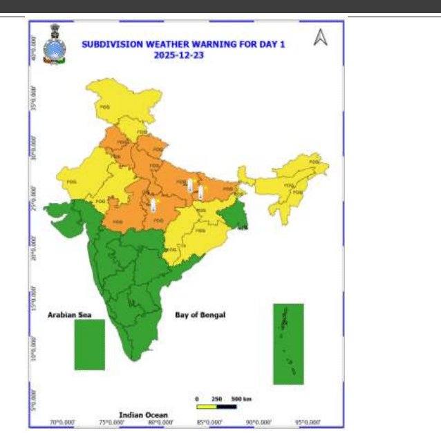 मौसम विभाग के अनुसार, उत्तर प्रदेश, हरियाणा, चंडीगढ़ और पंजाब में 29 दिसंबर तक रात और सुबह के समय घना से बहुत घना कोहरा छाए रहने की संभावना है. उत्तराखंड में यह स्थिति 28 दिसंबर तक बनी रह सकती है, जबकि मध्य प्रदेश में 25 दिसंबर तक घने कोहरे की चेतावनी दी गई है. बिहार में कुछ इलाकों में 25 दिसंबर तक घना कोहरा रहेगा और 26 से 28 दिसंबर के बीच फिर से कोहरे की संभावना जताई गई है. इसके अलावा जम्मू डिवीजन, हिमाचल प्रदेश और ओडिशा के कुछ हिस्सों में 28 दिसंबर तक, सब-हिमालयन पश्चिम बंगाल और झारखंड में 25 दिसंबर तक, राजस्थान और छत्तीसगढ़ में 24 दिसंबर तक तथा पूर्वोत्तर भारत में 26 दिसंबर तक कोहरे का असर रहने की आशंका है.