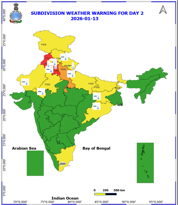 उत्तर भारत के कई हिस्सों में शीतलहर का असर और तेज होने वाला है. पंजाब, हरियाणा में 13 और 14 जनवरी को शीतलहर से लेकर गंभीर शीतलहर की स्थिति बन सकती है. राजस्थान में भी 13 जनवरी को शीतलहर की चेतावनी है यानी इन जगहों पर न्यूनतम तापमान 2-3 डिग्री सेल्सियस बना रहेगा.