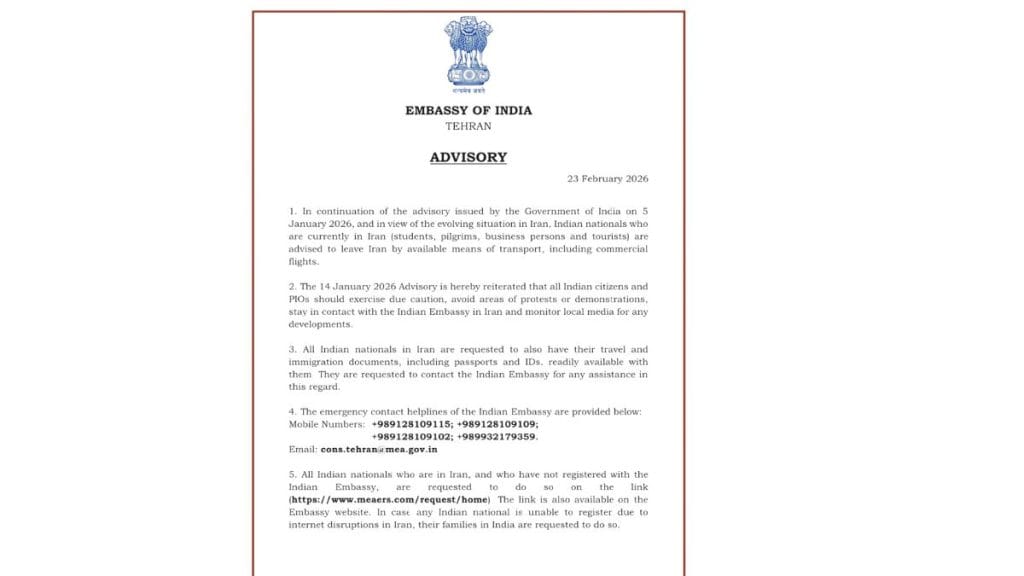 Embassy of India Tehran ने 23 फरवरी 2026 को जारी एडवाइजरी में कहा है कि ईरान में रह रहे भारतीय उपलब्ध ट्रांसपोर्ट से देश छोड़ दें. इसमें कमर्शियल उड़ानों का भी जिक्र किया गया है. दूतावास ने कहा है कि हालात बदल रहे हैं और सुरक्षा को ध्यान में रखते हुए यह कदम जरूरी है. छात्रों, तीर्थयात्रियों, व्यापारियों और टूरिस्ट को खास तौर पर सलाह दी गई है.