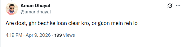अमन धायल नाम के एक X यूजर ने कहा कि घर बेचकर लोन खत्म कर देना चाहिए और जरूरत पड़े तो गांव में जाकर सादा जीवन जीना बेहतर विकल्प हो सकता है.
