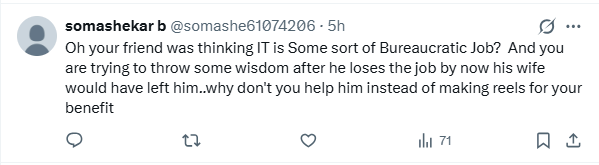 वहीं, सोमशेखर बी नाम के यूजर ने इस बात पर नाराजगी जताई कि लोग मदद करने के बजाय सलाह देने में लगे हैं. उन्होंने कहा कि ऐसी स्थिति में व्यक्ति को सहारा देने की जरूरत होती है, न कि सिर्फ आलोचना की.