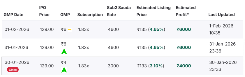 01 फरवरी को ग्रे मार्केट प्रीमियम 6 रुपये रहा. तीसरे दिन शाम तक IPO कुल 1.83 गुना सब्सक्राइब हुआ था. रिटेल कैटेगरी में 2.19 गुना बोली लगी. नॉन इंस्टीट्यूशनल निवेशकों ने 2.08 गुना आवेदन किए. QIB हिस्सा करीब 1.01 गुना भरा.