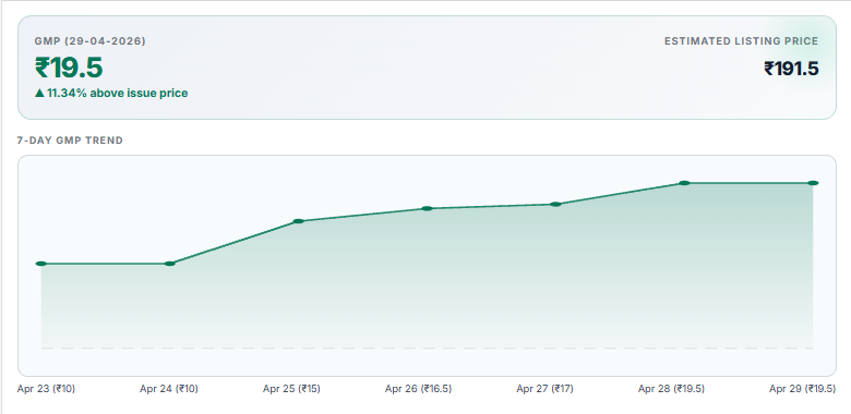 29 अप्रैल की सुबह 10 बजकर 1 मिनट पर इस इश्यू का ग्रे मार्केट प्रीमियम 19.5 रुपये है. मौजूदा जीएमपी के आधार पर कंपनी अपने प्राइस बैंड से लगभग 11.34 फीसदी ऊपर बाजार में लिस्ट हो सकता है. इससे निवेशकों को ₹15,600 रुपये का लिस्टिंग गेन हो सकता है. यानी 172 रुपये के अपर प्राइस बैंड वाले आईपीओ में निवेशकों को ₹15,600 का मुनाफा हो सकता है.