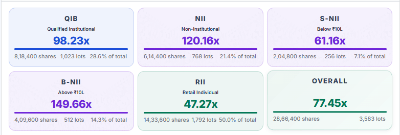 यह इश्यू 77.45 गुना सब्सक्राइब हुआ है. सबसे ज्याद बोली B-NII कैटेगरी में आई है. वहीं QIB कैटेगरी में 98.23 गुना और रिटेल कैटेगरी में 47.27 बोली लगी है. हालांकि, 28