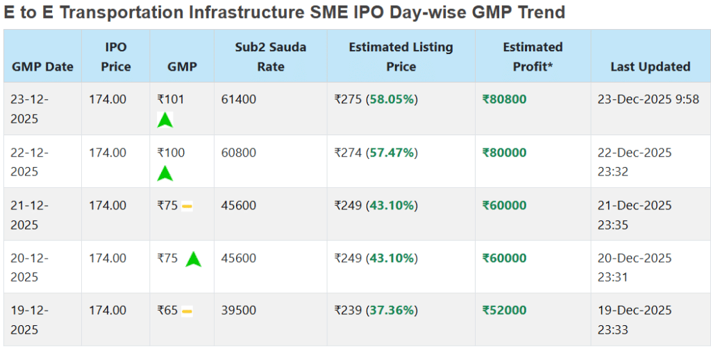 इसके GMP में लगातार रैली देखने को मिल रही है. 19 दिसंबर को इसका GMP 65 था. 23-Dec-2025 समय 9:58 AM तक इंवेस्टरगेन के मुताबिक, E to E Transportation Infrastructure SME IPO का GMP 101 रुपये चल रहा है. अगर अपर प्राइस बैंड 174 रुपये के आधार पर शेयर की लिस्टिंग करीब 275 रुपये बनती है. इस हिसाब से निवेशकों को 58.05 फीसदी का लिस्टिंग गेन मिल सकता है. हालांकि, ये अनुमान है, जरूरी नहीं कि ऐसा होता दिखे.