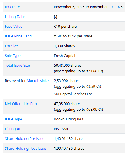 इस इश्यू का बुक रनिंग लीड मैनेजर (BRLM) SKI Capital Services Limited है, जबकि रजिस्ट्रार की भूमिका Skyline Financial Services Pvt Ltd निभा रही है. कंपनी के मजबूत नेटवर्क, अनुभवी निवेशक और तेजी से बढ़ते कारोबार को देखते हुए यह IPO निवेशकों के लिए एक आकर्षक अवसर माना जा रहा है.