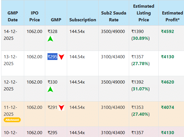 Investorgain के मुताबिक, इस आईपीओ का GMP आखिरी बार 14 दिसंबर 2025 को शाम 6:33 बजे अपडेट किया गया जो 328 रुपये पर चल रहा था. इस हिसाब से इसकी लिस्टिंग 1390 रुपये (अपर प्राइस बैंड 1062 रुपये + आज का GMP) पर हो सकती है. यानी निवेशकों को 30.89% का लाभ हो सकता है. इस आईपीओ का GMP शुरू से ही धांसू बना हुआ है. 13 दिसंबर को यह 295 रुपये था.