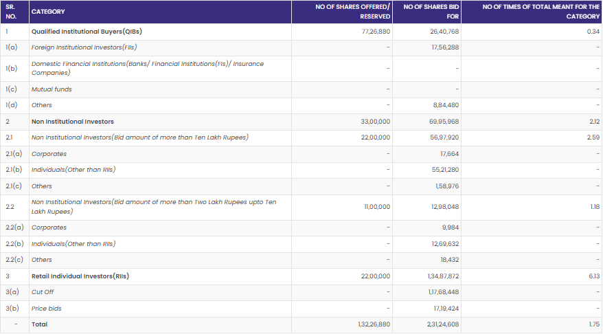 IPO के दूसरे दिन कुल 1.32 करोड़ शेयरों के मुकाबले करीब 2.3 करोड़ शेयरों के लिए बोली लगी. इससे साफ पता चलता है कि निवेशको के बीच काफी उत्साह है. सबसे ज्यादा उत्साह रिटेल निवेशकों में देखने को मिला, जहां यह हिस्सा 6.13 गुना सब्सक्राइब हुआ. नॉन-इंस्टीट्यूशनल इन्वेस्टर्स (NII) कैटेगरी में 2.12 गुना बोली लगी, जबकि क्वालिफाइड इंस्टीट्यूशनल बायर्स (QIB) का हिस्सा 0.34 तक ही भरा.