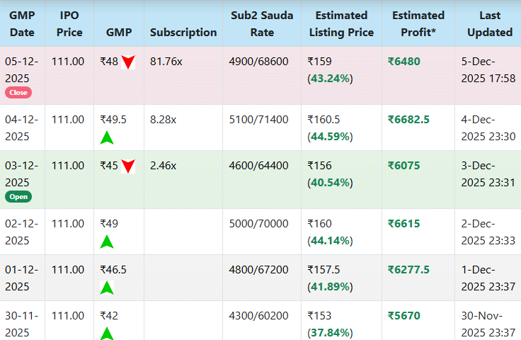 इस आईपीओ के GMP में लगातार तेजी देखी जा रही है. Investorgain के अनुसार, इस आईपीओ का GMP 5 दिसंबर की शाम 05:58 बजे ₹48 था. प्राइस बैंड 111 रुपये के आधार पर यह ₹159 पर लिस्ट हो सकता है. यानी इस पर 43.24% का लिस्टिंग गेन होने का अनुमान है.