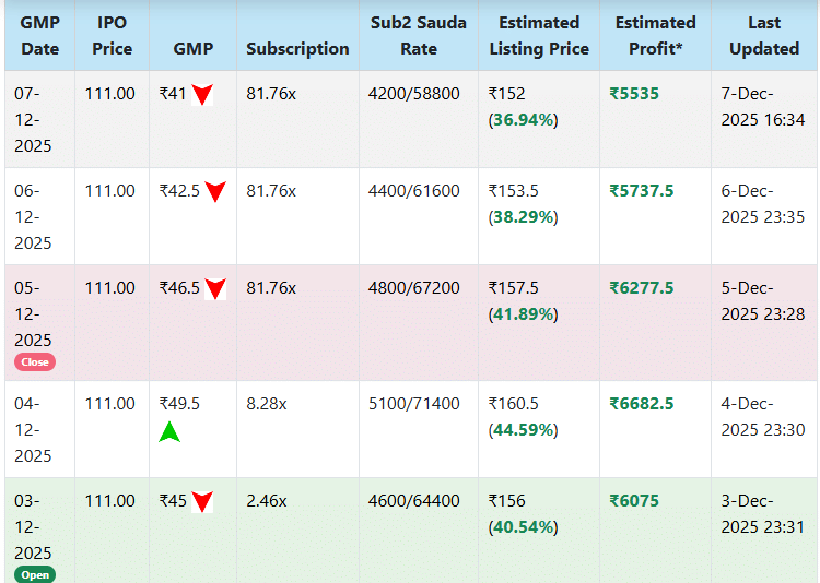 आईपीओ अलॉटमेंट 8 दिसंबर को पूरा होगा और 9 दिसंबर को शेयर डीमैट खातों में क्रेडिट किए जाएंगे. इसकी लिस्टिंग 10 दिसंबर को होगी. वहीं, ग्रे मार्केट प्रीमियम ने भी निवेशकों की उम्मीदों को बढ़ी दी हैं. Investorgain के मुताबिक, 7 दिसंबर को शाम 4:34 बजे इसका जीएमपी लगभग 41 रुपये पर था जो 111 रुपये के अपर प्राइस बैंड के मुकाबले 152 रुपये के अनुमानित लिस्टिंग प्राइस की ओर इशारा करता है. यानी लगभग 36.94 प्रतिशत लिस्टिंग गेन मिलने की उम्मीद है.