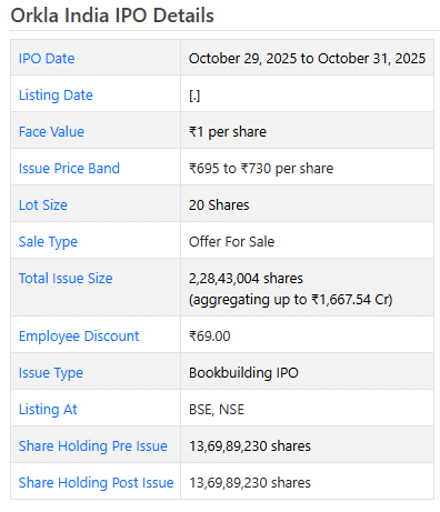 Orkla India IPO: Orkla इंडिया का IPO जल्द शुरू होने वाला है. इसके शेयरों की ग्रे मार्केट में अच्छी मांग दिख रही है. कंपनी ने अपने IPO के लिए प्राइस 695 से 730 रुपये के बीच तय की है. यह IPO 1667 करोड़ रुपये का है और 29 अक्टूबर को खुलेगा. यह 31 अक्टूबर को बंद होगा. यह पूरी तरह से OFS है. बड़े निवेशकों (एंकर इनवेस्टर्स) के लिए बोली 28 अक्टूबर को होगी. Orkla इंडिया, को पहले MTR फूड्स के नाम से जाना जाता था. यह एक पैकेज्ड फूड कंपनी है. यह मसाले, रेडी-टू-ईट खाना, मिठाइयां और नाश्ते के मिक्स जैसे उत्पाद बेचती है. इसके ब्रांड्स में MTR, ईस्टर्न और रसोई मैजिक शामिल हैं. कंपनी के प्रोडक्ट भारतीय घरों में बहुत लोकप्रिय हैं.
