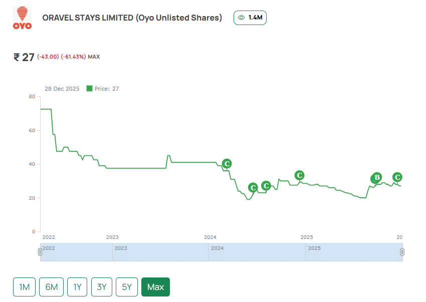 अनलिस्टेड मार्केट में OYO 27 रुपये पर कारोबार कर रही है. इसका 52-वीक हाई 57 रुपये और लो 27 रुपये है. कंपनी का मार्केट कैप 37,835 करोड़ रुपये है. इसका डेट-टू-इक्विटी रेश्यो 1.89 है. वहीं P/B रेश्यो 10 है और P/E रेश्यो 158.82 है.