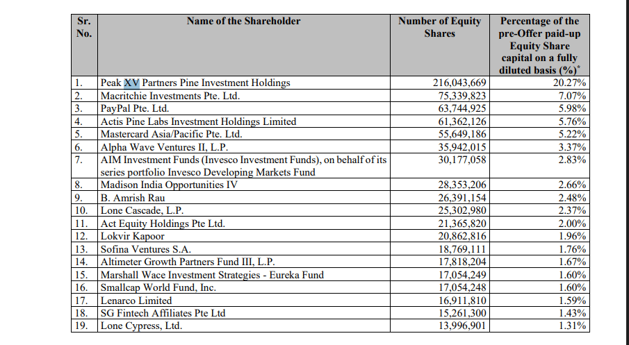 जहां नए निवेशक डिस्काउंट पर एंट्री करेंगे, वहीं शुरुआती निवेशक इस IPO में मल्टीबैगर रिटर्न के साथ मोटा मुनाफा बटोरेंगे. Peak XV Partners (पहले Sequoia Capital India) ने Pine Labs में लगभग 20 फीसदी हिस्सेदारी सिर्फ 5.60 रुपये प्रति शेयर की औसत कीमत पर खरीदी थी. अब इस हिस्सेदारी की वैल्यू 121 करोड़ रुपये से बढ़कर करीब 4,775 करोड़ रुपये हो गई है. यानी करीब 3,850 फीसदी का शानदार रिटर्न.