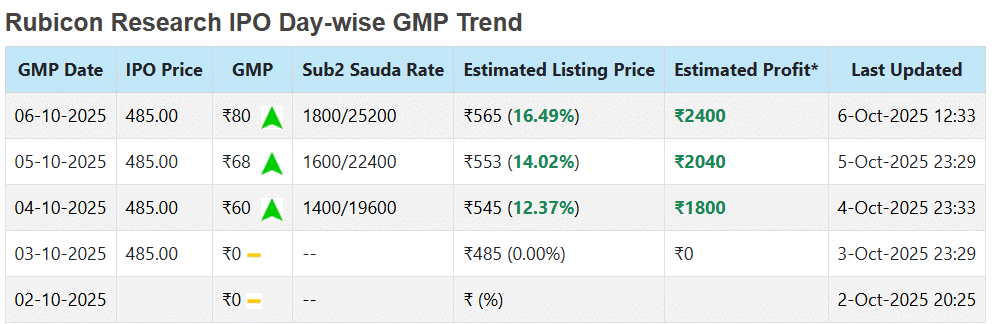 इंवेस्टरगेन के मुताबिक, Rubicon Research IPO का लेटेस्ट GMP (Grey Market Premium) 68 रुपये है. इस हिसाब से इसका अनुमानित लिस्टिंग प्राइस 553 रुपये हो सकता है, जो ऊपरी प्राइस बैंड से करीब 16.49 फीसदी का संभावित लिस्टिंग गेन दिखाता है. 4 अक्टूबर को 60 रुपये था, जो 6 अक्टूबर को 80 रुपये पहुंच गया है.