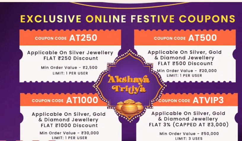 - ₹75,000 की डायमंड या प्लैटिनम ज्वेलरी पर ₹2,000 का वाउचर,