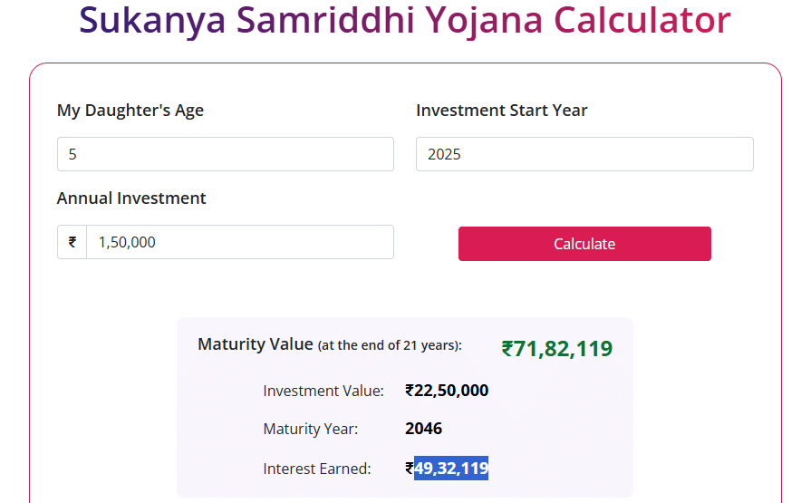 सुकन्या समृद्धि योजना में सालाना 1,50,000 रुपये तक ही जमा किए जा सकते हैं. इसे एकमुश्त या मासिक जमा किया जा सकता है. अगर 1.50 लाख को मासिक आधार पर जमा किया जाए तो 12500 रुपये हर महीने जमा करने होंगे. इसमें 15 साल तक निवेश करना होता है जिससे 15 सालों में कुल 22,50,000 रुपये का निवेश हो जाएगा. अभी इसमें निवेश करने पर 8.2 प्रतिशत की दज से ब्याज मिलेगा और 21 साल पूरे होने पर बिटिया को कुल 71,82,119 रुपये मिलेंगे. इसमें 49,32,119 रुपये का ब्याज मिलेगा.