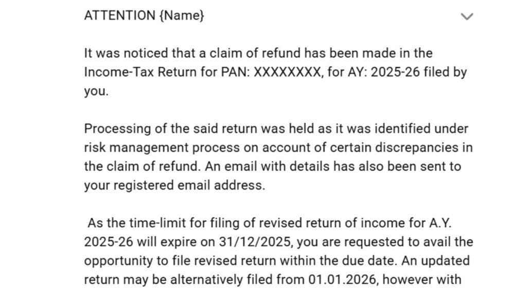 अगर आपको इनकम टैक्स डिपार्टमेंट से रिफंड या ITR में गड़बड़ी से जुड़ा मैसेज मिला है, तो सतर्क हो जाना जरूरी है.31 दिसंबर 2025 असेसमेंट ईयर 2025 26 के लिए revised ITR दाखिल करने की आखिरी तारीख है.इस दिन के बाद आप रिटर्न में कोई सुधार नहीं कर पाएंगे.